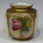 A Royal Worcester bone china posy vase, circa 1917, of globular form, painted with pink roses within moulded borders, puce printed factory marks to base, height 8.5cm.