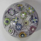 A Perthshire limited edition latticinio glass paperweight, dated 1973, No. 96/300, with multiple florettes and silhouettes against an amethyst ground, diameter 7cm, with certificate and box, together with a Whitefriars millefiori glass paperweight, dated 1974, with top window and six side printies, diameter 7.5cm, boxed.