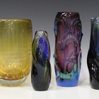 A Czech Skrdlovice 'pulled-lobed' vase, circa 1959, designed by Jan Beranek, pattern No. 5988, decorated in shades of pink, green and blue, height 30.2cm, together with two similar Skrdlovice glass vases and a large amber tinted controlled bubble glass vase.