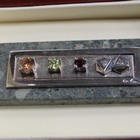 A Russian silver and gemstone mounted rectangular panel, set with two diamonds, a pale brown zircon, a chrysolite and a garnet, length 6cm, with case, a Russian papier-mâché square box and a set of six cloisonné napkin rings with floral decoration.