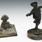 A 19th century French brown patinated cast bronze figure of a late 18th century young man, raised on a circular marble base, height 16.5cm, together with an Austrian cast bronze model of a sphinx, marked '1875 Geschutzt', height 9.5cm.