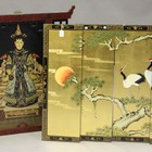 A Chinese painted and lacquered panel depicting a seated empress, within a red painted and gilt frame, 102cm x 92cm, together with a modern painted and gilt four-section screen, decorated with red capped cranes, height 91cm.