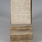 WITCHCRAFT. [A manuscript amateur grimoire. N.p.: n.d. but mid/late 17th century] 476 numbered pp., oblong, 8vo (86 x 140mm.) The majority of handwritten leaves with red ruled border. (Ink stain to 4pp., browning and creasing to some page margins, p.50 torn out, missing all leaves after p.476). Contemporary black morocco (missing rear cover, damp-stain to upper cover). Note: contains densely handwritten notes on charms, remedies and spells such as 'how to catch pigeons', 'how to make a woman dance naked', 'how to know if any sicke person shall die', 'how to recover decayed tobacco' and the 'rarest and most hidden secrets for to procure love proved to bee effectuall in this age by many'. Contains two tables and a drawing of a pentagram ('Pentaculum Salamonis'), and also some recipes.