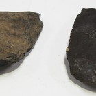 A Palaeolithic obsidian hand axe, detailed in white ink 'Awash River Ethiopia' with Hugh Fawcett monogram, length 12cm, together with another stone hand axe, detailed 'N. Sahara desert', length 11cm.