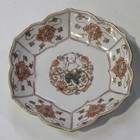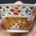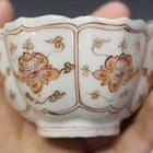 A Chinese export porcelain tea bowl and stand, Kangxi period, each of hexagonal outline, painted in iron red, green and gilt with a boy and lotus panels, underglaze blue mark to bases, total height 4.5cm, together with a small group of other Chinese export porcelain tea bowls and saucers, Yongzheng and Qianlong periods, with various floral, fish and deer decoration, and a famille rose export porcelain wine cup and stand, Yongzheng period, each piece painted with a boy within iron red, gilt and floral borders, total height 4cm (some with faults).