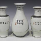 A group of Chinese porcelain, 20th century, comprising a blue and white double gourd vase, height 24.5cm, two enamelled biscuit porcelain figures of immortals, height 21.5cm, a yellow and blue decorated bottle vase with applied iron red dragon, height 22cm, and three famille rose vases, painted with figures and calligraphic text, iron red printed pseudo marks of Qianlong to bases, heights 21.5cm and 19.5cm (one with chip to base).