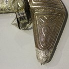 An Arabian silver mounted presentation jambia and scabbard, mid-20th century, the imitation ivory handle with piqué inlaid decoration, the scabbard with filigree work and braided decoration, total length 31cm, within a red case with gilt Sultanate of Oman insignia. Provenance: this jambia was presented to Sir William Luce during his time as Governor of Aden and political resident in the Persian Gulf between 1956 and 1966.
