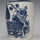 A Caughley porcelain Fisherman and Cormorant pattern tea caddy, circa 1779-91, of tapering cylindrical form, printed in underglaze blue, printed 'S' mark to base, height 10.5cm (lacking cover).