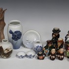 A Copenhagen porcelain figure, modelled as a boy with a horn, seated on a barrel, model No. '3689', a similar figure of a boy holding a kitten, model No. '758', and a group of decorative ceramics, including crested china, Artone Dickens character jugs and Toby jugs and other Copenhagen ceramics (minor faults and repairs).