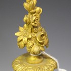 A late 19th century French ormolu and jewelled porcelain mantel clock garniture, the clock with eight day movement striking on a bell, the backplate stamped with 'AB' (Achille Brocot) maker's mark, the porcelain circular dial with painted Cupid, gilt Roman hours and jewelled flowerheads on a pale green ground and inscribed 'Achille Brocot', the case with urn surmount above cast scrolls and festoons, height 35.5cm, flanked by a pair of matching twin branch candelabra, height 40cm (lacking pendulum).