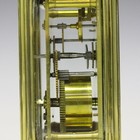 An early 20th century brass cased carriage timepiece with eight day movement, the enamel dial with black Roman numerals, the backplate stamped 'R & Co' (Richard & Co) , the glazed case with swing handle and reeded pillars, on bun feet, height 15cm, with winding key and travelling case (faults).