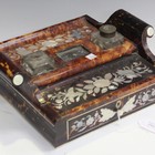 A Victorian tortoiseshell and engraved mother-of-pearl desk standish, the rectangular body with scrolling side handles and pen depressions, fitted with a single frieze drawer, width 35cm (faults).