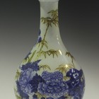 A Chinese blue and white export porcelain guglet, Qianlong period, painted in underglaze blue with peonies and rocks, and embellished with iron red and gilt bamboo, height 24.5cm (two chips to rim).