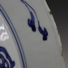 A pair of Chinese blue and white export porcelain circular dishes, Kangxi period, each painted with a central circular panel of dense fruiting and flowering branches emanating from rocks, within a segmented panelled border and rim filled with flowers, underglaze blue lu (rank) seal mark and double ring to bases, diameters 34cm and 34.5cm (one with hairline cracks).