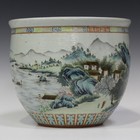 A Chinese famille rose porcelain jardinière, mark of Qianlong but probably 20th century, the 'U' shaped body painted with a continuous coastal landscape with figures, boats, pavilions, trees, rocks and mountains, all beneath a polychrome key fret border incorporating a painted iron red six character mark, height 22cm.