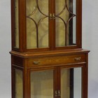 An Edwardian mahogany display cabinet by James Shoolbred & Co with inlaid decoration, the moulded pediment above a pair of glazed doors, the base fitted with a drawer above a pair of glazed doors, on bracket feet, height 200cm, width 92cm, depth 42cm.