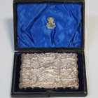 A late 19th century Indian silver card case, repoussé decorated and chased with deities and elephants within scroll borders, unmarked, height 10cm, cased, the lid interior detailed 'P. Orr & Sons Madras'.
