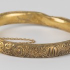 An Italian gold oval hinged bangle, applied with filigree decoration, the front detailed 'Roma', inside width 5.5cm, with a Goldsmiths & Silversmiths case.
