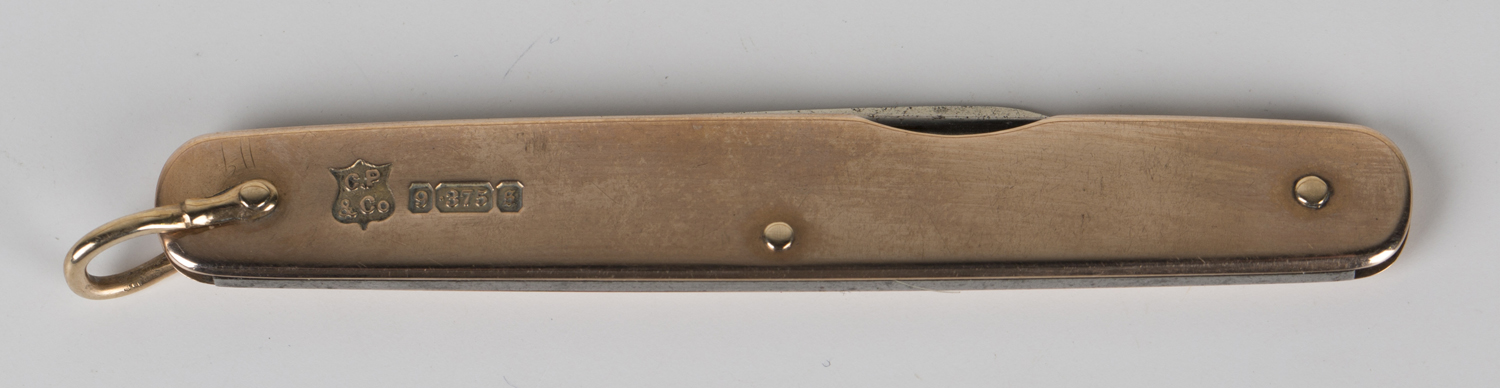 A 9ct gold mounted folding fruit knife, Sheffield 1910 by Charles Packer & Co, length 7.5cm.