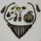 An early 20th century double-sided glazed pendant locket with colourless paste set surround and bow surmount, diameter 4.8cm, a pair of amethyst paste earrings and a small collection of assorted jewellery.