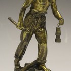 Joseph Carlier - a late 19th/early 20th century French gilt and brown patinated cast bronze figure of a miner carrying a Davy lamp, bearing cast signature, raised on a circular green marble plinth, height 23cm.