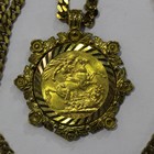 A George V sovereign 1911, in a 9ct gold pendant mount with cast floral decoration, and a 9ct gold faceted curblink chain, length 61cm.