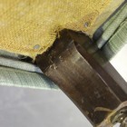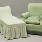 An early 20th century scroll armchair, upholstered in green cotton, on square tapering legs and castors, height 98cm, width 71cm, together with a box seat day bed with gingham covers, length 155cm.