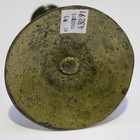 A 16th/17th century patinated metal spoon with fig-shaped bowl, length 11.5cm, together with a small patinated bronze candlestick, height 10.3cm.