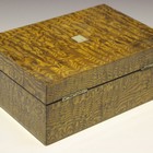 A late Victorian burr ash sewing box by Parkins & Gotto, Oxford St. London, the interior with a removable tray fitted with mother-of-pearl sewing implements and bearing incised maker's plaque, width 30.5cm.