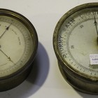 A Victorian tole painted circular spice box, the compartmentalized interior fitted with a central removable grater, diameter 19.5cm, together with two holosteric barometers and a Loveridge & Co patent lamp, height 19cm.
