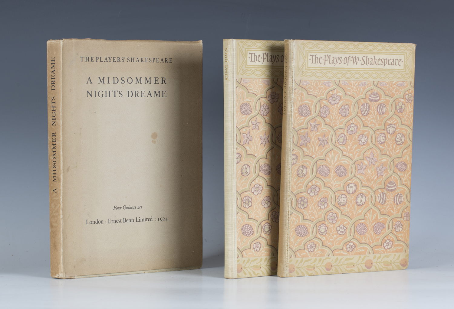 NASH, Paul (illustrator). - William SHAKESPEARE. A Midsommer Nights Dreame. London: Ernest Benn Ltd., 1924. Limited edition, this number 545 of 550 copies, 4to (319 x 238mm.) 5 colour plates by Paul Nash with tissue-guards and 9 black and white illustrations. (Some browning to margins.) Original cloth-backed boards (minor spotting to lower edge), dust-jacket (browning, creasing to upper edge). - And two further illustrated Shakespeare volumes ('Love Labour's Lost' and 'King John' from the Limited Editions Club, 1939-1940, 4to) (3).