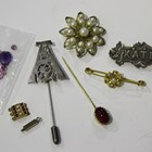 A gilt metal and cultured pearl brooch, designed as a flowerhead, a gold and seed pearl bar brooch with a flowerhead motif, a silver brooch, detailed 'Kate', Chester 1893, a paste simulating carbuncle garnet single stone stickpin, a sterling silver stickpin with an initial 'A' motif, a gold, ruby and half-pearl three row clasp, another clasp and a group of twelve unmounted coloured gemstones and a pear shaped amethyst.