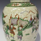 A Chinese famille verte crackle glazed porcelain ginger jar and domed cover, early 20th century, the ovoid body decorated with warriors, height 29cm (minor rim restoration).