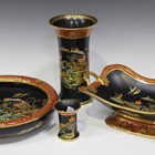 A group of four pieces of Wiltshaw & Robinson Carlton Ware, decorated in the black ground Mikado pattern, 1920, comprising a two-handled footed dish, a circular bowl with turnover rim, a flared rim vase, height 20.5cm, and a smaller similar vase, height 7.5cm, each with black printed bluebird mark and pattern No. 2881 to base.