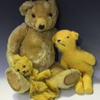 A mid-20th century mohair teddy bear with amber and black eyes, stitched snout and four claws to each limb and jointed body with felt pads, height 46cm, together with another teddy bear and a glove puppet.