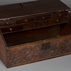 An 18th century oak table top chest, the sloping hinged top revealing drawers above a carved front panel, detailed 'A.F 1722', flanked by floral scrolls, height 38cm, width 86cm, depth 45cm.