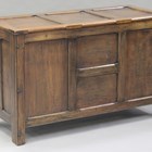 A George V oak panelled coffer, the hinged lid and panelled sides raised on stile supports, height 79cm, width 129cm, depth 57cm.