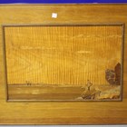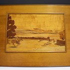 A pair of 20th century marquetry panels, titled 'Huntsman' and 'The Ditch', 52cm x 70cm, together with another marquetry panel by Ashworth, titled 'Under Tall Trees', 34cm x 24cm.