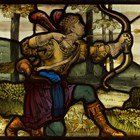 A pair of Arts and Crafts leaded and stained glass rectangular panels, depicting a kneeling medieval archer within a woodland landscape and a similar falconer tending to his bird, 46cm x 52cm, both mounted within wooden frames and backed in glass (some faults).