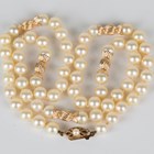 A single row necklace of uniform cultured pearls, spaced with ridged divisions at intervals, on a gold and cultured pearl clasp, detailed '9ct', length 51cm.