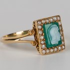 An 18ct gold dyed green agate cameo and seed pearl rectangular ring, the rectangular cameo carved as the portrait of a classical warrior within a border of seed pearls between split shoulders, ring size approx O.