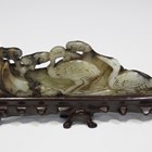 A Chinese jade carving, Ming dynasty, carved and pierced with a pair of crane beside rocks and lingzhi fungus, the stone of celadon and black mottled tone, length 12.5cm, with a carved wood stand, together with a Tibetan gilt bronze Buddha's arm, 18th century, modelled holding a kapala, length 15cm.