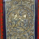 Two Chinese silk embroidered sleeve panels, late 19th/early 20th century, each worked in coloured and metal threads, one depicting figural roundels within floral borders, 46.5cm x 12.5cm, the other with birds, prunus and rocks, 56cm x 11.5cm, both framed and glazed.