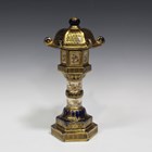 A Japanese Satsuma earthenware koro and cover by Kozan, Meiji period, modelled in the form of a hexagonal lantern, painted and gilt with figures and flowers reserved against a blue and gilt ground, gilt signature and Shimazu mon to base, height 24cm (chip to rim and cover repaired), together with a Satsuma vase, painted with a landscape, iron red painted signature and gilt Shimazu mon to base, height 25cm.