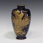 A Japanese Satsuma earthenware vase, Meiji period, the ovoid body finely gilt with a scene of a peacock and blossoming branches on a blue glazed ground, unmarked, height 21.5cm.