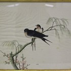 Two Chinese school trade watercolour paintings on paper, early 19th century, one depicting a stork-billed kingfisher perched on a blossoming branch, the other depicting a pair of swallows on a willow branch above pink prunus, both signed, 31.5cm x 38cm, framed and glazed.