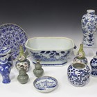 A group of Chinese porcelain, 18th century and later, including a blue and white export porcelain soup tureen, Qianlong period, painted with a fenced garden, length 34cm (cracked and lacking cover), a blue and white cylindrical jar and cover, height 11.5cm, a pair of famille rose double gourd shaped vases and blue and white vases (faults).