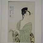 After Kitagawa Utamaro - a Japanese polychrome oban woodblock print, 20th century, depicting a head and shoulders portrait of a beautiful bijin, 40cm x 27cm, together with three similar Japanese prints.