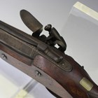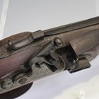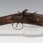 A flintlock blunderbuss by John Clive with signed steel barrel, barrel length 38cm, top mounted spring bayonet, signed foliate engraved lock plate, swan neck cock, full-stocked, chequered at hand, with steel furniture and brass capped ramrod.
