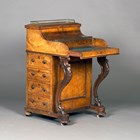 A mid-Victorian walnut piano-top Davenport, the pop-up top above a hinged serpentine lid revealing a pull-out writing surface, the side fitted with four drawers, raised on carved scroll supports and bun feet, height 93cm, width 57cm, depth 57cm.